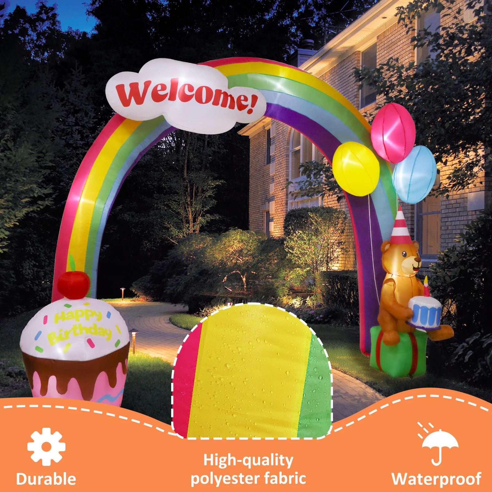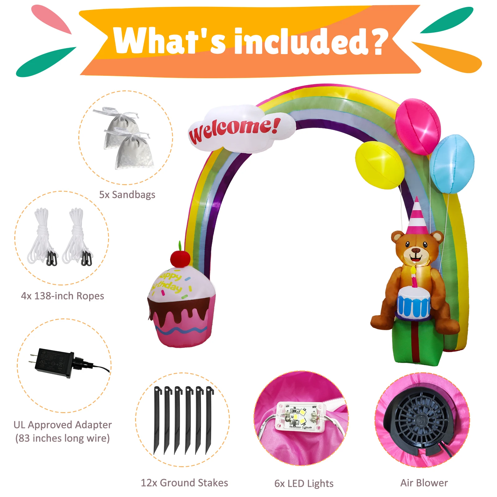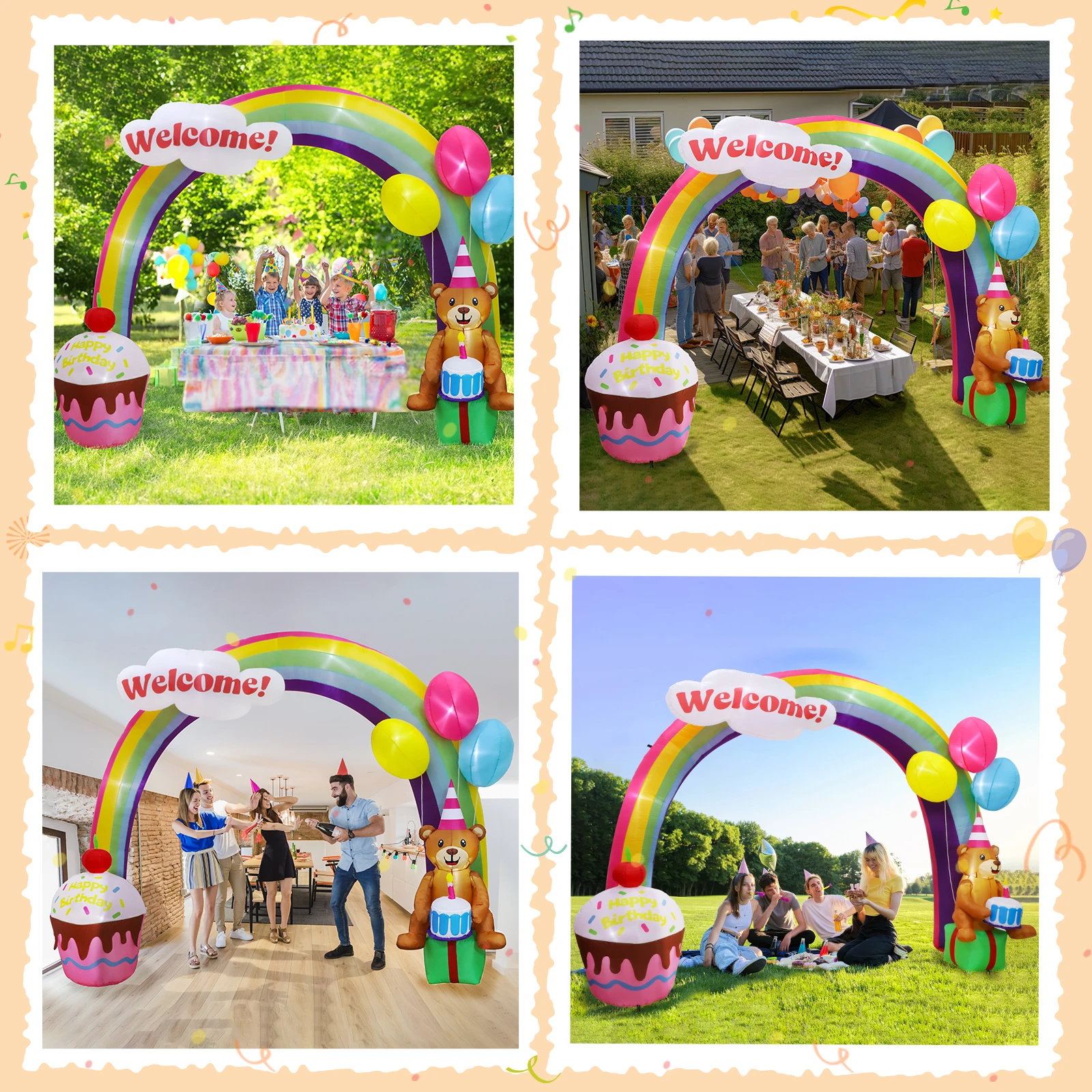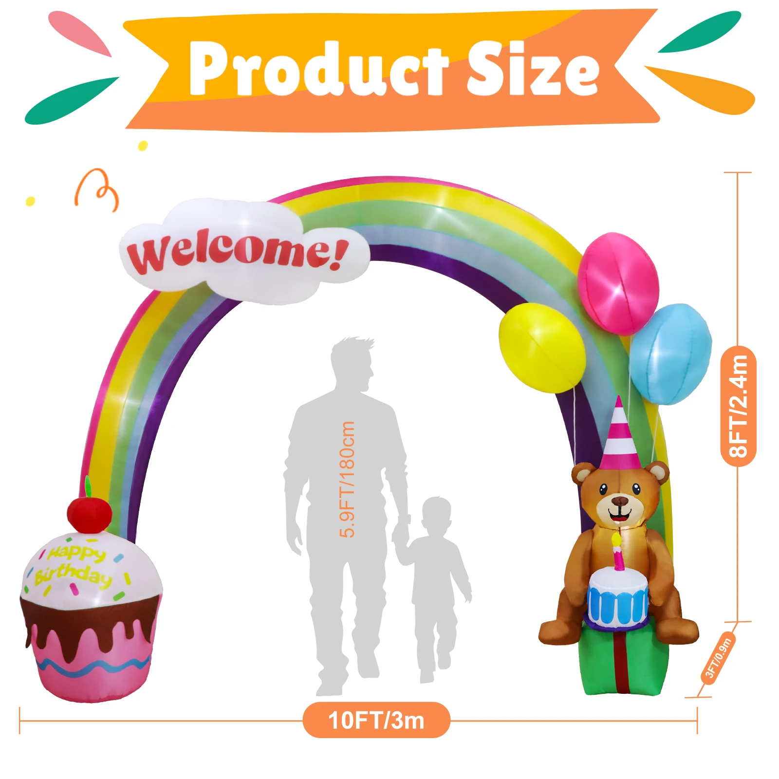 1.Size and Design: This inflatable decoration is 10ft in height and features a vibrant rainbow birthday cake design. The arch-shaped structure creates an eye-catching centerpiece for birthday celebrations.