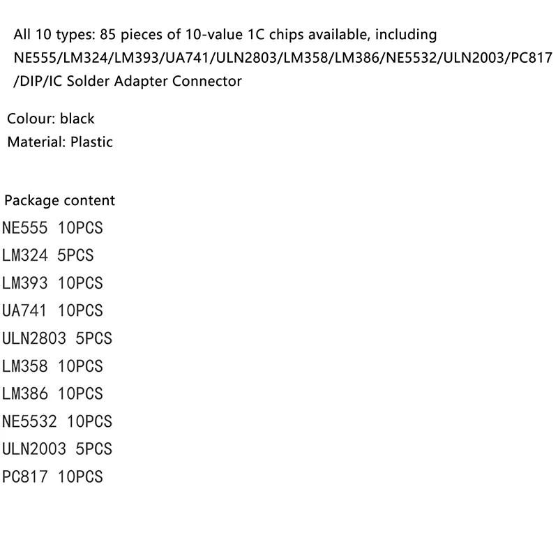 Color: Black Material: Plastic Packaging content: NE555 10PCS LM324 5PCS LM393 10PCS UA741 10PCS ULN2803 5PCS LM358 10PCS LM386 10PCS NE5532 10PCS ULN2003 5PCS PC817 10PCS