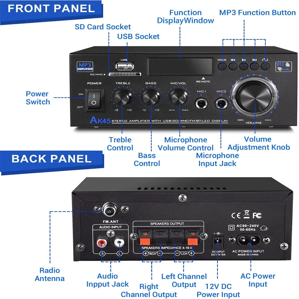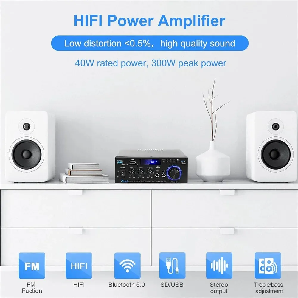 Upgrade Version AK-45 Digital Audio Amplifier Fully updated design, 40W+40W rated power, perfect match for 4-8 inch passive speakers. Function upgrade, adding Mic Jack. Besides, as a digital amplifier receiver, the sound quality is more perfect than ordinary analog amplifiers, With built-in power transfer board which support AC 110-240V power input and DC 12V/5A power input, ready to use.