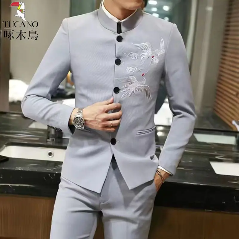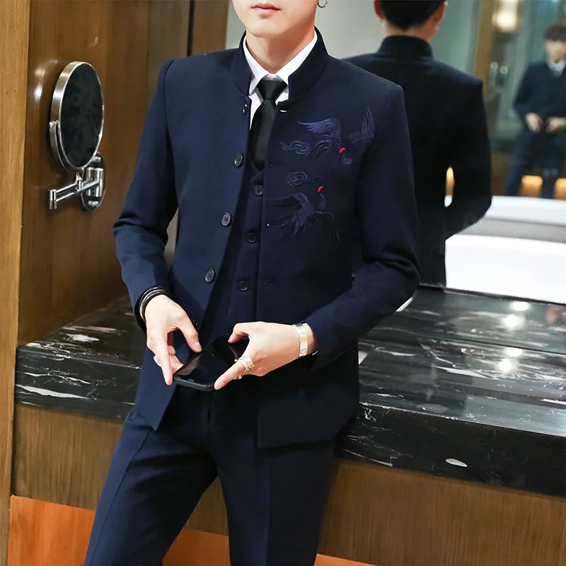 Fashion Crane Embroidery Stand Collar Men’s Casual 3 Pcs Suit Set Male Jacket Groom Wedding Dress Blazers Dress Trousers Vest